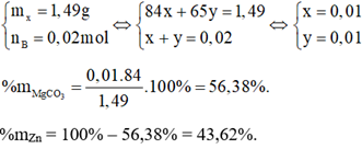 Cho 1,49 gam hỗn hợp X gồm: MgCO3 và Zn vào một lượng vừa đủ dung dịch HCl. Sau phản ứng thu được dung dịch A và 0,4958 lít khí B ở đkc. Xác định % khối lượng của các chất trong X.
