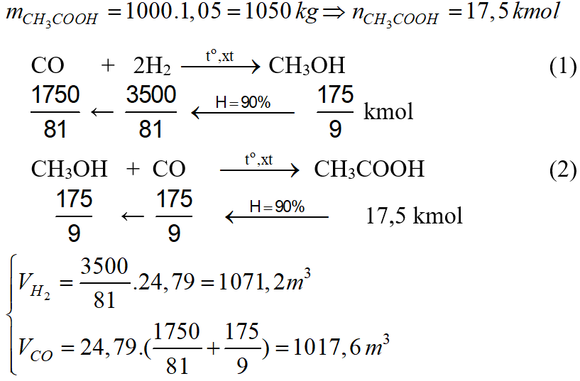 Giả sử hiệu suất của các phản ứng (1) và (2) đều đạt 90%. Để sản xuất 1000 lít acetic acid (D = 1,05 g mL-1), cần thể tích khí CO và H2 (ở điểu kiện chuẩn) lần lượt là