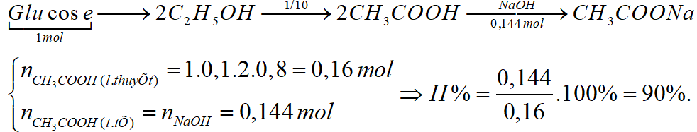 Từ 180 gam glucose (C6H12O6), bằng phương pháp lên men rượu, thu được a gam ethanol (hiệu suất 80%). Oxi hoá 0,1a gam ethanol bằng phương pháp lên men giấm, thu được hỗn hợp X. Để trung hoà hỗn hợp X cần 720 mL dung dịch NaOH 0,2M. Hiệu suất quá trình lên men giấm là