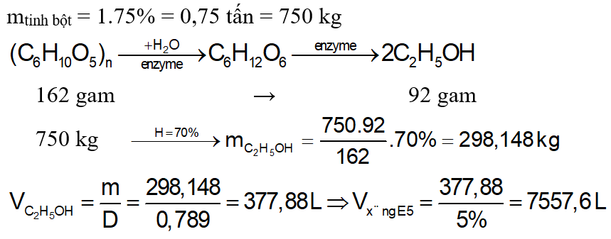 Từ 1 tấn tinh bột ngô có thể sản xuất được bao nhiêu lít xăng E5 (chứa 5% ethanol về thể tích), biết tinh bột ngô chứa 75% tinh bột, hiệu suất chung của cả quá trình điều chế ethanol là 70%, khối lượng riêng của ethanol là 0,789 g/mL.