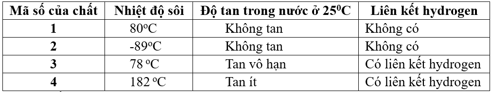 Tiến hành khảo sát một số tính chất vật lý của 4 chất sau: ethane, benzene, phenol, ethanol. Các chất trên được đánh số không theo thứ tự. Bảng sau cho biết tính chất của 4 chất trên: