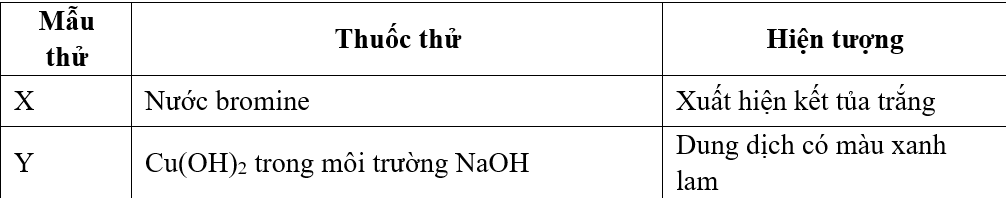 Kết quả thí nghiệm trong bài thực hành về alcohol – phenol của hai chất X và Y với thuốc thử được ghi ở bảng sau: