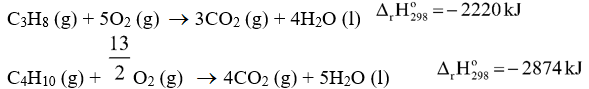 Một bình gas (khí hóa lỏng) chứa hỗn hợp propane và butane với tỉ lệ mol 1:2. Xác định nhiệt lượng tỏa ra khi đốt cháy hoàn toàn 12 kg khí gas trên ở điều kiện chuẩn.