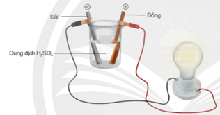 Nhúng thanh sắt và thanh đồng vào cốc chứa dung dịch H2SO4 0,5M. Dùng dây dẫn điện nối thanh sắt và thanh đồng với đèn led như hình vẽ.