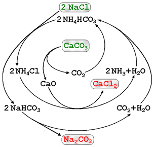 NaCl + NH₃ + H₂O + CO₂ → NH₄Cl + NaHCO₃