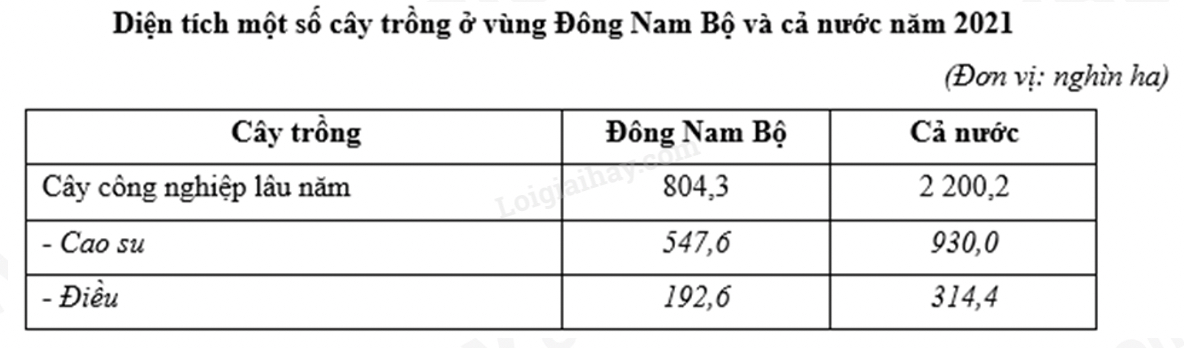 => Diện tích cao su và điều chiếm: (740,2/804,3)*100 = 92,0% diện tích cây công nghiệp lâu năm của vùng Đông Nam Bộ năm 2021.