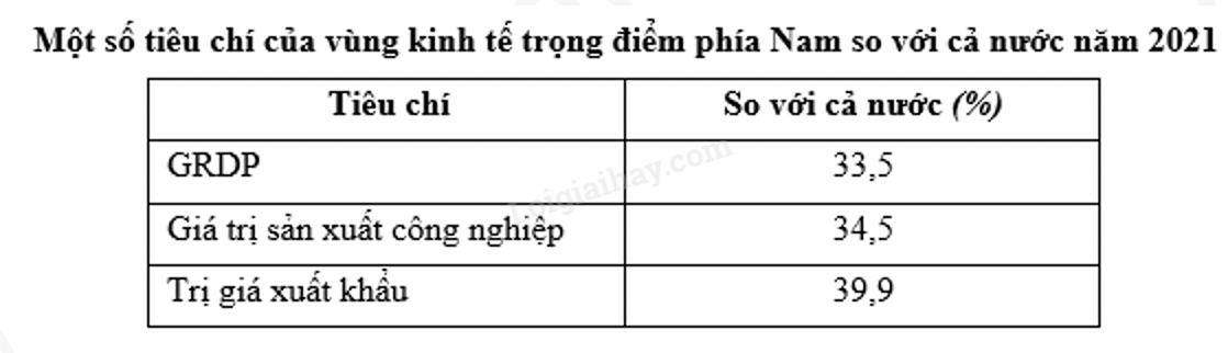 b) Rút ra nhận xét chung và nhận xét từng biểu đồ về tỉ trọng GRDP, giá trị sản xuất công nghiệp, trị giá xuất khẩu của vùng kinh tế trọng điểm phía Nam so với cả nước năm 2021.