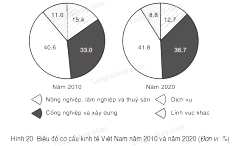 Đối chiếu những số liệu trong biểu đồ năm 2020 với biểu đồ năm 2010 cho thấy, cơ cấu kinh tế tiếp tục chuyển dịch theo hướng giảm tỉ trọng khu vực nông nghiệp, lâm nghiệp và thuỷ sản (từ 15,4% (2010) giảm xuống còn 12,7% (2020)), tăng tỉ trọng khu vực công nghiệp và xây dựng (tăng từ 33,0% (2010) lên 36,7% (2020)) và dịch vụ (tăng từ 40,6% (2010) lên 41,8% (2020)). Biểu đồ thể hiện thành tựu của công cuộc công nghiệp hoá và hiện đại hoá của Việt Nam.