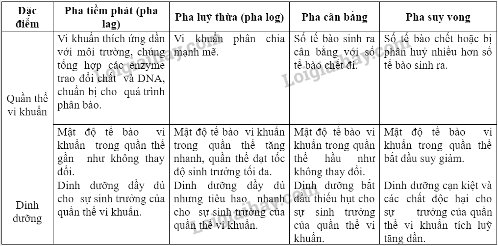 Sinh trưởng của quần thể vi khuẩn nuôi trong hệ kín được chia thành 4 pha: tiềm phát (lag), luỹ thừa (log), cân bằng và suy vong.