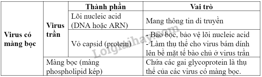 | Cho biết các thành phần cấu tạo nên virus và nêu chức năng của các thành phần đó. |