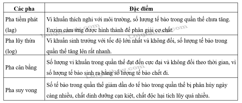 Trong môi trường nuôi cấy không liên tục, quần thể vi khuẩn phát triển theo 4 pha: pha tiềm phát, pha lũy thừa, pha cân bằng và pha suy vong.