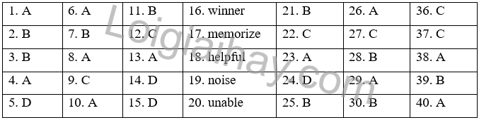 I. Choose the word whose underlined part is pronounced differently. II. Choose the word that has a different stressed syllable from the rest. IIII. Choose the best option (A, B, C or D) to complete each of the following questions. IV. Write the correct form of the words in brackets. V. Choose the option that best completes each blank in the passage. Write A, B, or C in the blank.