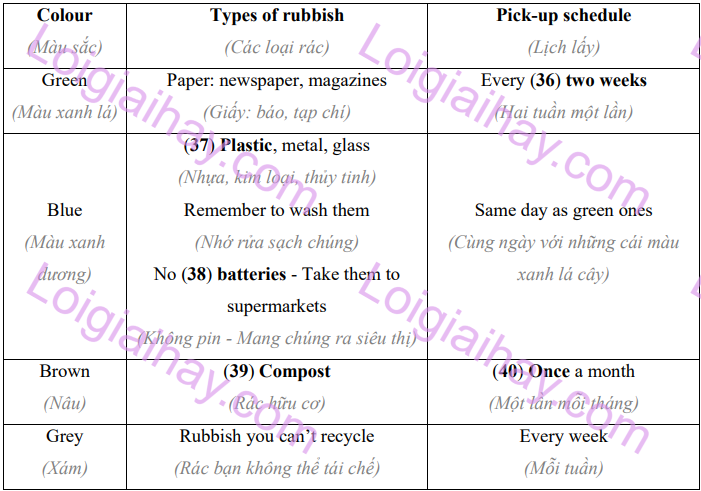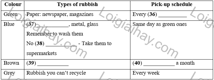 Tôi là Bob Holden và tôi đến từ hội đồng hạt Bucks. Tôi ở đây để giải thích cách thức hoạt động của hệ thống tái chế của chúng tôi. Mỗi nhà có bốn thùng, một thùng rác màu xám lớn, một thùng rác màu xanh dương lớn và hai thùng, một nâu và một xanh. Đặt tất cả giấy của bạn vào hộp màu xanh lá cây, báo và tạp chí. Chúng tôi thu thập hộp màu xanh lá cây hai tuần một lần. Chúng tôi cũng thu gom thùng rác Big Blue trong cùng ngày. Cái đó dùng cho nhựa, kim loại và thủy tinh. Hãy chắc chắn rằng bạn rửa những loại rác này xin vui lòng. Chúng tôi không muốn hũ mứt và hũ sữa chua bẩn tại trung tâm tái chế của mình. Thật không may, bạn không thể bỏ pin vào thùng màu xanh. Bạn có thể mang chúng đến bất kỳ siêu thị nào. Hộp màu nâu là thùng rác hữu cơ. Chúng tôi thu gom cái này mỗi tháng một lần. Cuối cùng, chúng tôi thu thập thùng màu xám mỗi tuần. Nó dành cho rác mà bạn không thể tái chế.