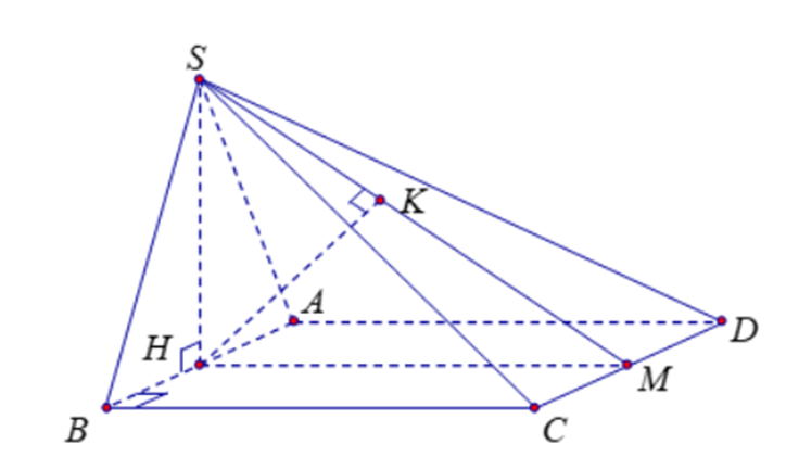\(\frac{1}{{H{K^2}}} = \frac{1}{{S{H^2}}} + \frac{1}{{H{M^2}}} \Rightarrow HK = \frac{{\sqrt {21} }}{7}\).