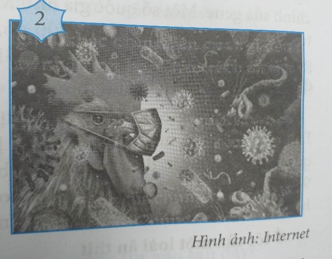 - Hình ảnh 2: minh họa cho tác dụng của chỉnh sửa gene đối với vật nuôi – gà. Gà được bảo vệ trước virus cúm gia cầm (hình ảnh gà đeo khẩu trang, gà được bảo vệ với công nghệ chỉnh sửa gene; vô số virus cúm gia cầm với nhiều hình dạng và màu sắc khác nhau chứng tỏ độ phức tạp mà các vaccine phòng ngừa không đủ sức chống lại/ bảo vệ gia cầm)