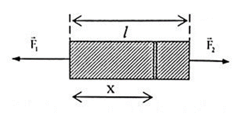 Lực đàn hồi xuất hiện trong thanh ở vị trí tiết diện của thanh cách đầu chịu lực F1 một đoạn x là: \(F = \frac{{{F_1}(l - x) + x{F_2}}}{l}\)