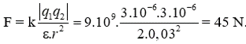 Hai điện tích điểm q1 = +3 μC và q2 = -3 μC, đặt trong dầu ( ε = 2) cách nhau một khoảng r = 3 cm. Lực tương tác giữa hai điện tích đó là