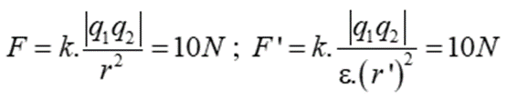 Hai điện tích điểm đặt trong không khí cách nhau 12 cm, lực tương tác giữa chúng bằng 10 N. Đặt chúng vào trong dầu cách nhau 8 cm thì lực tương tác giữa chúng vẫn bằng 10 N. Hằng số điện môi của dầu là: