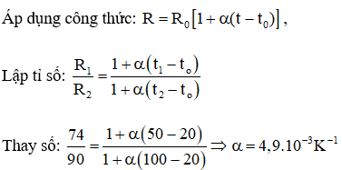 Một sợi dây đồng có điện trở 74 W ở 500 C, điện trở của sợi dây đó ở 1000 C là 90 W. Hệ số nhiệt điện trở của dây đồng là: