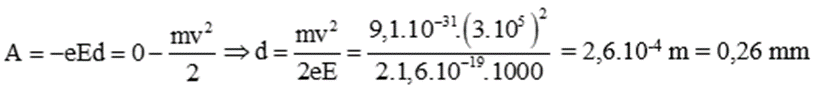 Một electron chuyển động dọc theo đường sức của một điện trường đều. Cường độ điện trường E = 1000 V/m. Vận tốc ban đầu của electron là 3.105 m/s, khối lượng của elctron là 9,1.10-31kg. Tại lúc vận tốc bằng không thì nó đã đi được đoạn đường bao nhiêu, tính theo đơn vị mm)