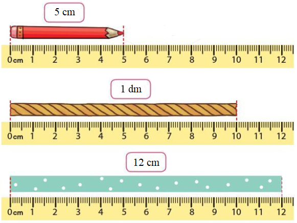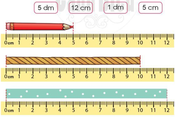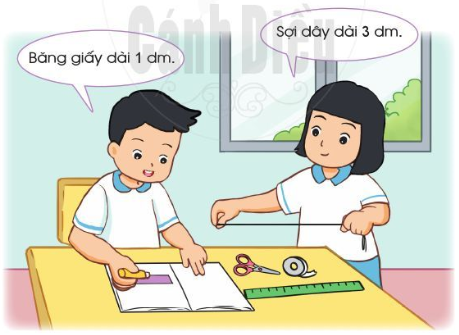 Áp dụng cách chuyển đổi 1 dm = 10 cm hay 10 cm = 1 dm để đổi các số đo 1 dm, 2 dm, 3 dm về số đo có đơn vị là xăng-ti-mét, sau đó học sinh thực hành tự cắt các băng giấy (hoặc sợi dây) có độ dài cho trước.
