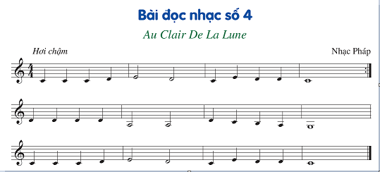 Bài đọc nhạc số 4 gồm hai nét nhạc. Tuy khác nhau về giai điệu nhưng tiết tấu hai nét nhạc giống nhau.