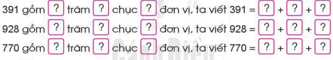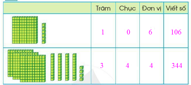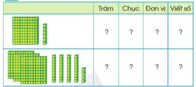 Xác định các số có ba chữ số từ hình vẽ rồi viết số trăm, chục, đơn vị thích hợp.