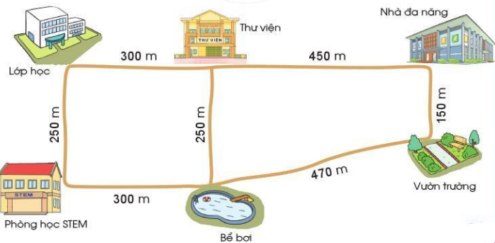 Quãng đường từ phòng học STEM – lớp học – thư viện – nhà đa năng là