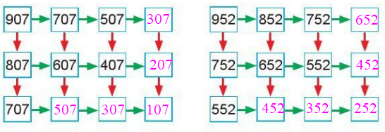 b) Quan sát các hình vẽ ta thấy hai số đứng cạnh nhau trong hàng ngang, hàng dọc sẽ hơn kém nhau 100 đơn vị hoặc 200 đơn vị. Từ đó ta điền được các số còn thiếu.