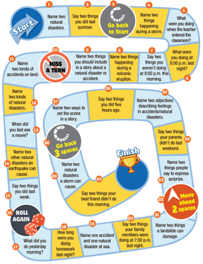 Play the game in pairs or small groups. Use rubbers as markers. Roll the dice to move across the board. Answer correctly or go back one space.