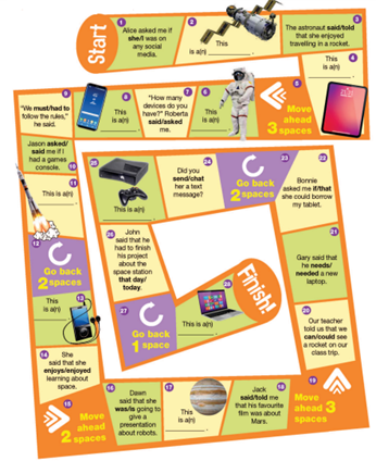Play the game in pairs or small groups. Use rubbers as markers. Roll the dice to move across the board. Answer correctly or go back one space.