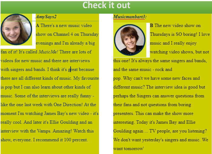 A Có một chương trình video ca nhạc mới trên Kênh 4 vào các tối thứ Năm và tôi là một người hâm mộ lớn của nó! Nó có tên là MusicMe! Có rất nhiều video về âm nhạc mới và có các cuộc phỏng vấn với các ca sĩ và ban nhạc. Tôi nghĩ nó thật tuyệt vì có tất cả các thể loại âm nhạc khác nhau. Yêu thích của tôi là nhạc pop nhưng tôi cũng có thể tìm hiểu về các loại âm nhạc khác. Một số cuộc phỏng vấn thực sự hài hước - như cuộc phỏng vấn tuần trước với One Direction! Hiện tại, tôi đang xem video mới của James Bay - nó thực sự rất hay. Và sau đó là Ellie Goulding và một cuộc phỏng vấn với Vamps. Thật tuyệt! Xem chương trình này đi, mọi người. Tôi đề cử nó 100 phần trăm.