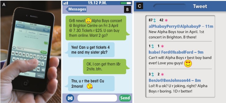 4. Study the Writing box. In pairs, write out the texts and tweets in picture B and C with all the words.