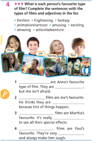 4: *** What is each person's favourite type of film? Complete the sentences with the types of films and adjectives in the list.