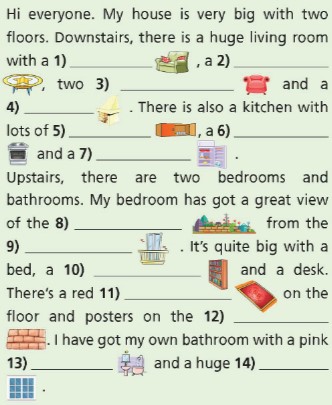 Hi everyone. My house is very big with two floors. Downstairs, there is a huge living room with a (1) sofa, a (2) coffee table, two (3) armchairs and a (4) fireplace. There is also a kitchen with lots of (5) cupboards, a (6) cooker and a (7) fridge. Upstairs, there are two bedrooms and bathrooms. My bedroom has got a great view of the (8) garden and from the (9) balcony. It's quite big with a bed, a (10) bookcase and a desk. There's a red (11) carpet on the floor and posters on the (12) wall. I have got my own bathroom with a pink (13) baths and a huge (14) window.