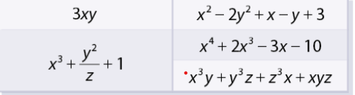 \(\begin{array}{l}{x^2} - 2{y^2} + x - y + 3\\{x^4} + 2{x^3} - 3x - 10\\{x^3}y + {y^3}z + {z^3}x + xyz\end{array}\)