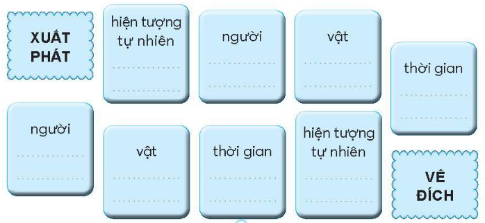 Điền vào mỗi ô trống dưới đây 2 từ chỉ người, vật, hiện tượng tự nhiên, thời gian (mỗi từ chỉ dùng một lần).