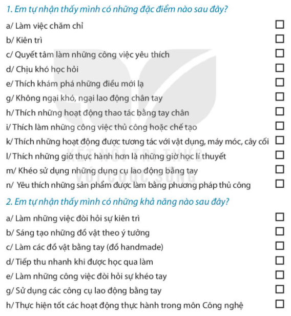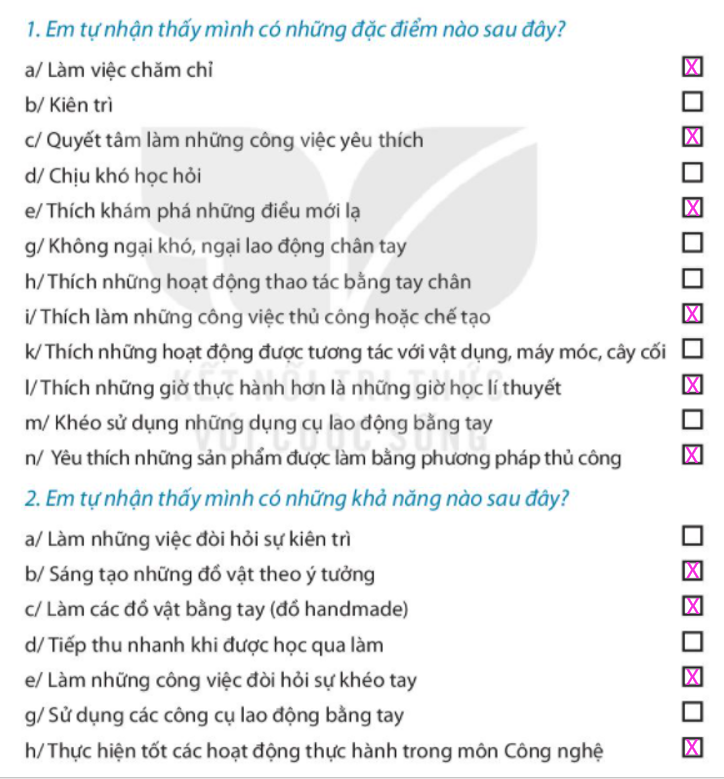 Đánh dấu X vào ô trống ở những phương án em chọn. Nêu những việc em đã chuẩn bị để tập làm nghề truyền thống. Nêu những việc em đã thực hiện để rèn luyện bản thân theo yêu cầu của nghề truyền thống.