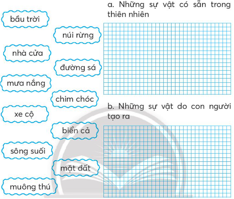 a. Những sự vật có sẵn trong thiên nhiên: bầu trời, núi rừng, biển cả, sông suối, mưa nắng, mặt đất, muông thú, chim chóc.