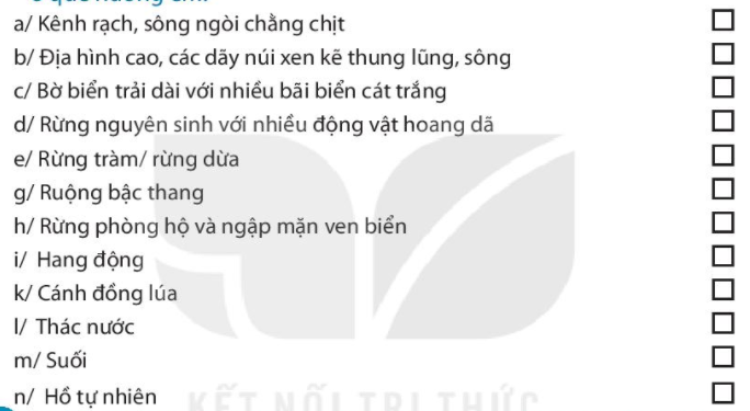 Đánh dấu X vào ô tương ứng với những phong cảnh thiên nhiên có ở quê hương em. Kể tên một số tác phẩm thơ, văn, bài hát ca ngợi vẻ đẹp thiên nhiên quê hương mà em biết. Viết 5 câu giới thiệu về một cảnh đẹp thiên nhiên của quê hương mà em cảm thấy tự hào và yêu thích. Ghi lại cảm xúc của em về cảnh quan thiên nhiên tươi đẹp ở nơi em sống.