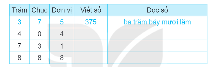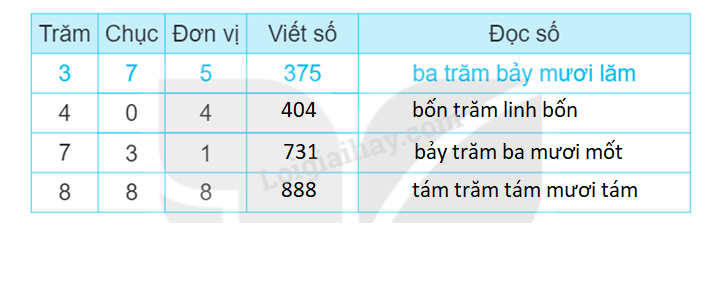 Viết số (hoặc đọc số) theo thứ tự từ hàng trăm, hàng chục đến hàng đơn vị.
