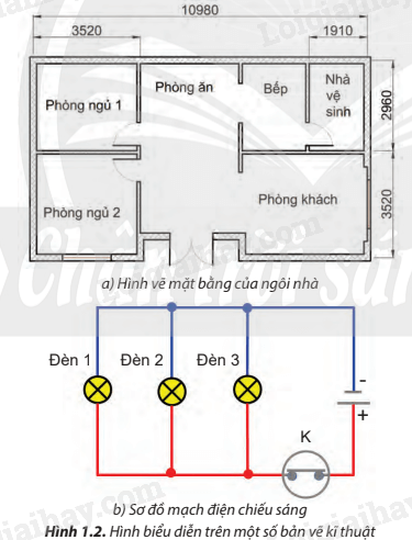 - Hình 1.2b trình bày sơ đồ mạch điện chiếu sáng có 3 bóng đèn, khóa điện, nguồn điện.
