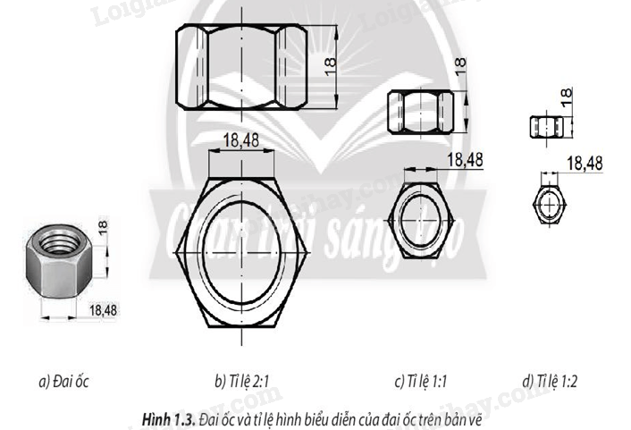 - Hình 1.3b: kích thước trên hình biểu diễn lớn gấp đôi kích thước tương ứng của đai ốc hình 1.3a