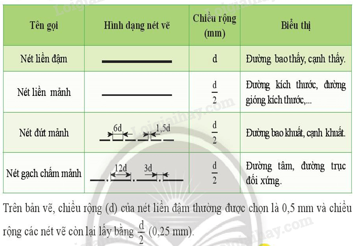 Nét vẽ được chọn làm cơ sở để xác định chiều rộng các loại nét vẽ còn lại trên bản vẽ là nét liền đậm. Cụ thể, các nét vẽ còn lại có chiều rộng bằng \(\frac{1}{2}\) nét liền đậm.