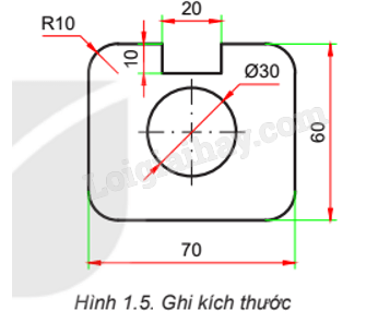 Quan sát hình 1.5 để nhận dạng các đường gióng, đường kích thước và giá trị của kích thước.