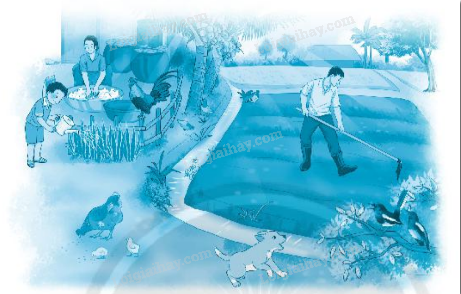 Em quan sát kĩ bức tranh và viết những từ ngữ chỉ hoạt động của người, con vật vào vở bài tập.