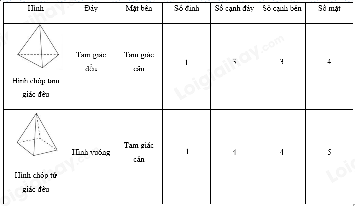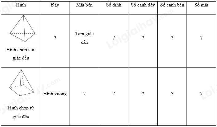 Sử dụng kiến thức về hình chóp tam giác đều, hình chóp tứ giác đều rồi điền vào bảng