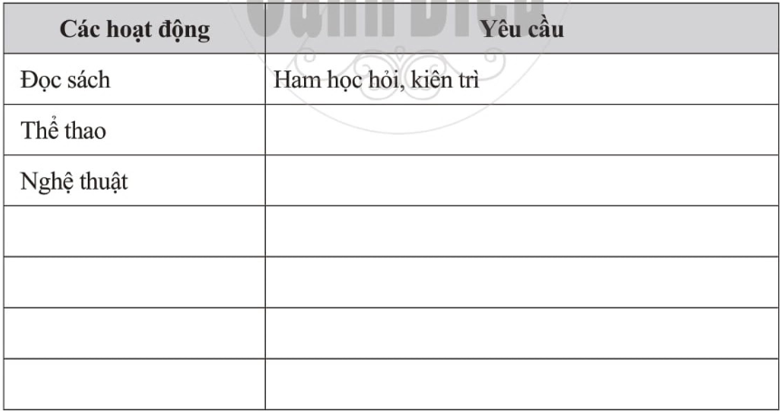 Hãy tìm hiểu những yêu cầu (tiêu chí) được đặt ra đối với từng hoạt động trong nhà trường bằng cách hoàn thành bảng bên dưới: