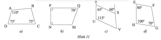 Tìm số đo các góc chưa biết của các tứ giác trong Hình 11.
