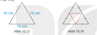 Vẽ và cắt một tam giác đều có cạnh 10 cm (H10.13) rồi gấp theo đường màu cam để được hình chóp tam giác đều (H.10.14)